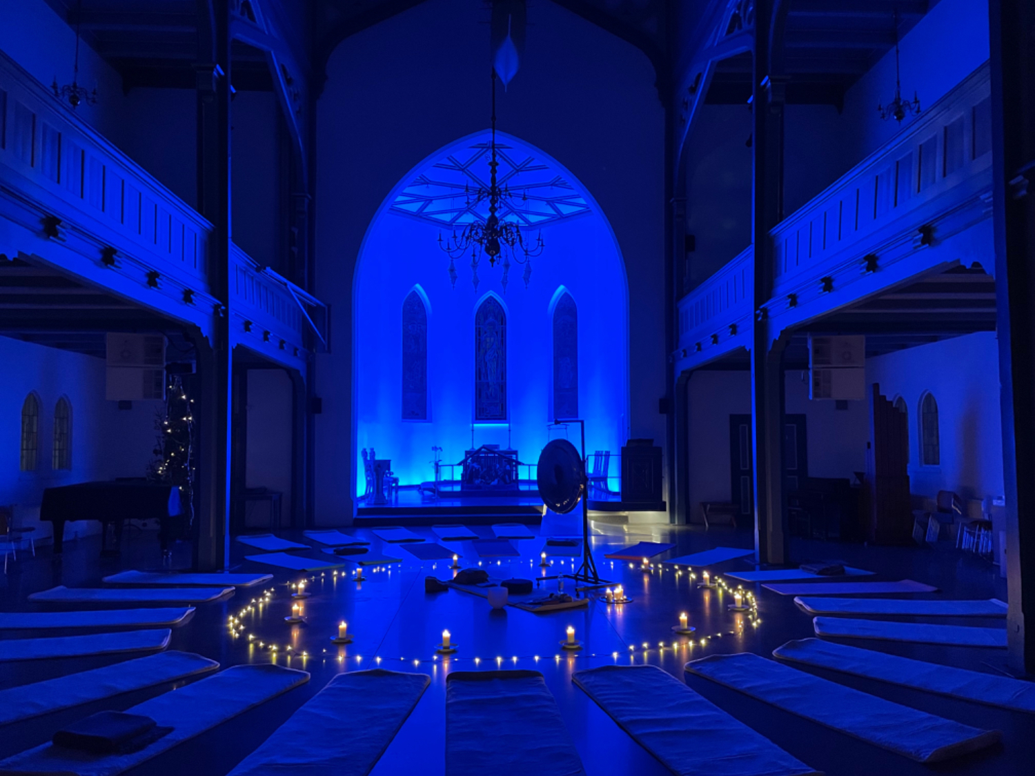 Magisk gongbad, deilig stressreduksjon, visjoner, indre ro, meditativt, terapeutisk, rensende og lykkebringende latmannsyoga - alt i ett - i det vakre kirkerommet.